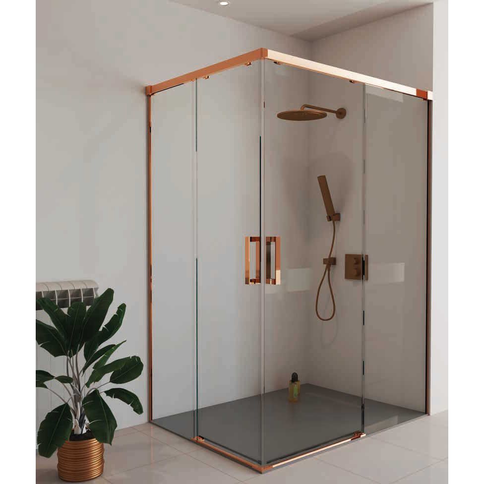 Hoekinstap Cosmo van 6 mm veiligheidsglas met schuifdeuren, magneetsluiting en vuil- en waterafstotende anti-kalk oppervlaktebehandeling. Standaard hoogte 195cm, maximale hoogte 220cm